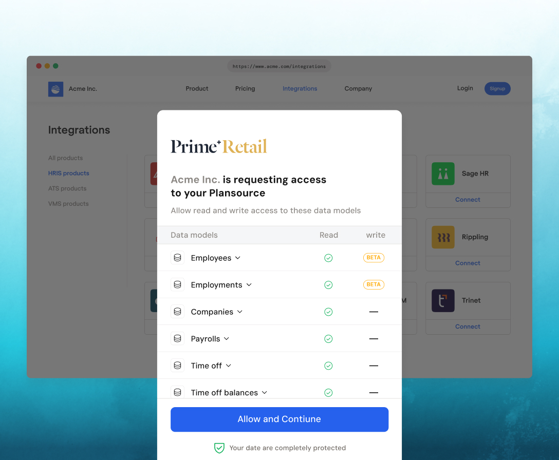 One REST API for Prime Retail and 60+ other HR systems. Same endpoints, same data models, regardless of which HRIS your customer uses.